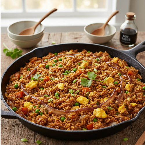 Use leftover rice, frozen peas, eggs, soy sauce.