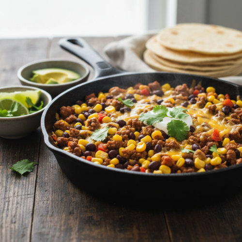 Ground beef, taco seasoning, beans, corn, and rice—all in one pan.